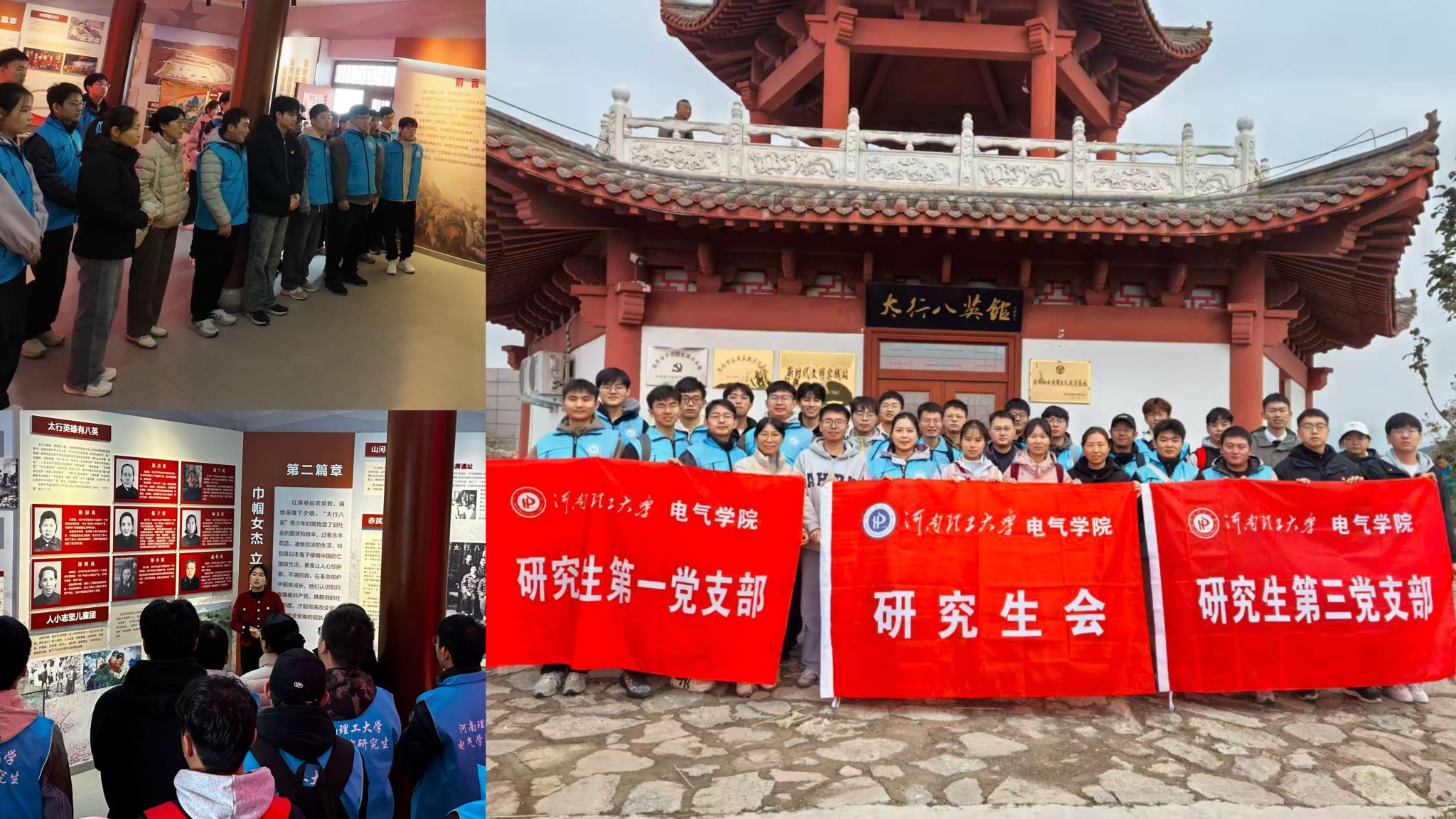 在太行八英纪念馆内,研究生骨干们庄严肃穆地听取讲解员生动讲述"太行八英"的革命事迹。"太行八英"被誉为"太行山上的八盘雄鹰",由连启英、赵桂英、靳禄英、赵兰英、郜明英、郜小妞、靳子荣、林发英八位青年女共产党员组成。在抗日战争时期,她们以焦作北部山区为根据地,运用游击战术,因地制宜开展地雷战,巧妙设计子母雷、连环雷等多种地雷形式,有效阻击日军的进犯;解放战争时期,她们在生产劳动中担当能手,在支前工作中成为模范,继续顽强战斗,沉重打击了国民党正规军及返乡团势力。通过观看展板实物、聆听英雄故事,骨干们深刻体会到八英同志不畏艰难、英勇斗争、保卫家园的革命精神。