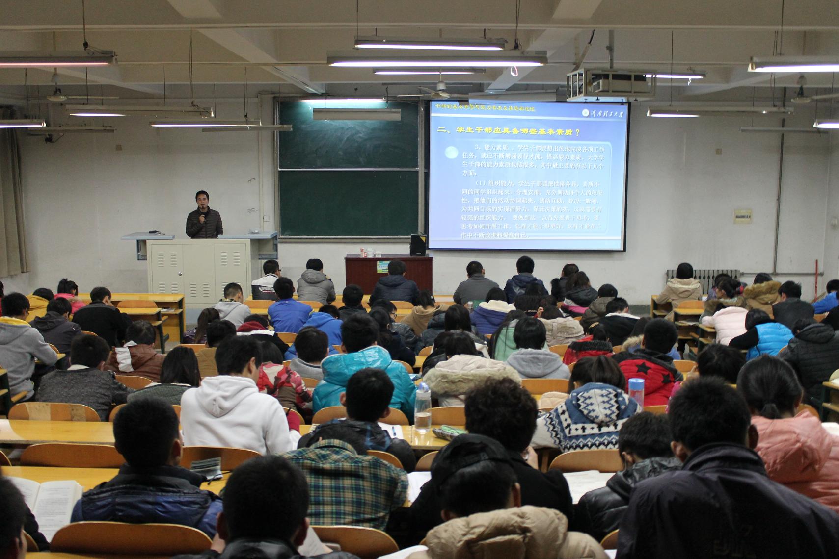 本次培训分别以“大学生应该掌握哪些礼仪”、“学生干部的基本素质与能力要求”、“学生干部主要职责与善于总结勇于创新”为主题,通过具体的生活实例,向同学们详细诠释了学生干部的主要职责。王瑞从“什么是学生干部”、“学生干部应具备哪些素质”、“如何做好一名学生干部”、“学生干部应具备表率性”四个方面来阐述,他提出,学生要养成良好的学习习惯,认真学习先进的科学文化,培养良好的人文修养和心理素质。提高道德修养,做到严于律己宽于待人,具备处理和老师及同学关系的能力。同时他还强调,学生干部必须始终牢固树立全心全意为同学服务的观念,要有高度的责任感,无论何时何地都要把“关心同学、服务同学、帮助同学”放在第一位。郑伟则以亲身经历与幽默诙谐的故事为例,告诉同学们礼仪在生活和工作中的重要性,并详细讲解关于仪表、服饰、沟通、电话、和宴会等方面的礼仪。李伟伟以“学生干部主要职责”、“建立健全制度规范”、“做好日常学生工作”、“善于总结勇于创新”四个主题,阐明了学生干部的责任与义务,从考风考纪、宿舍建设、心理健康等日常学生工作出发详谈了大学生应该具备的素质,并告诫同学们合理安排学习和工作时间,积极创新工作方式方法,做符合时代要求的大学生。