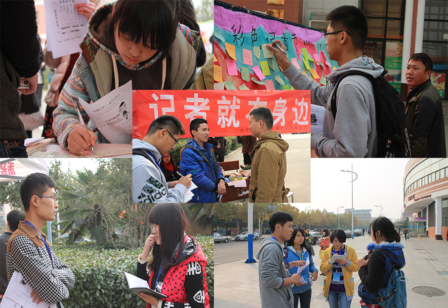上午9时30分,活动人员在我校学苑餐厅东门搭起帐篷,并摆设记者宣传展板和记者节祝愿板等设施。活动一开始,就邀请全校学生参与体验“我是记者”、“一字千金新闻改错”、“摄影小比赛”和“留言送祝福”等系列活动。同学们兴致盎然,积极参与,通过参与活动既收获采访的乐趣,又体验了新闻工作的特点,对记者这个职业有了较初步的了解。之后全体成员纷纷走到校园各个角落,运动场、超市、餐厅,走向不同人群,以走访形式对他们就记者节和时事要闻的看法等问题进行了采访,深入了解他们对新闻工作者认识和看法,并向他们普及相关知识。他们的采访感染了每一位被采访者,现场互动热烈,笑声连连。在校园记者们采访的同时摄影比赛也在火热进行,参与活动的同学拿起自己的相机或手机拍摄当天风景或人物将记者节的精彩瞬间定格。